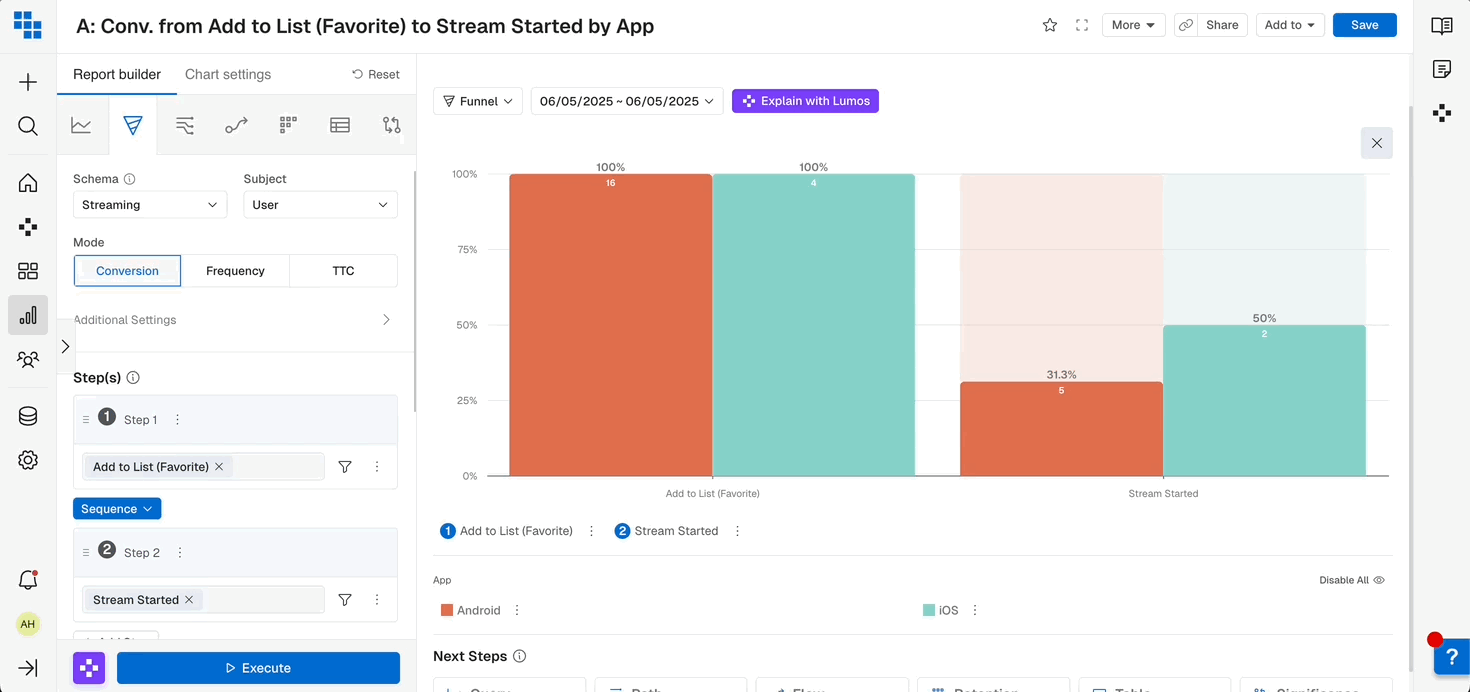 Between Step 1 and 2, or 2 and 3 etc. there may be instances where you only want to count a conversion if a user did NOT perform an event in-between. We allow this by clicking “Step Options” and selecting “Exclude Events”.