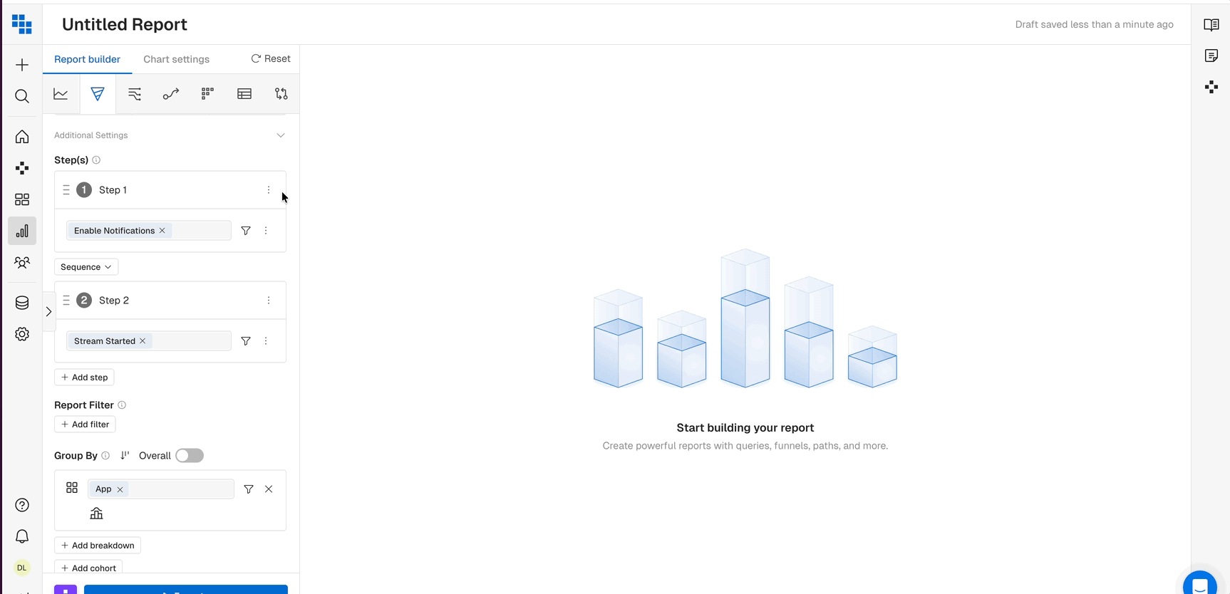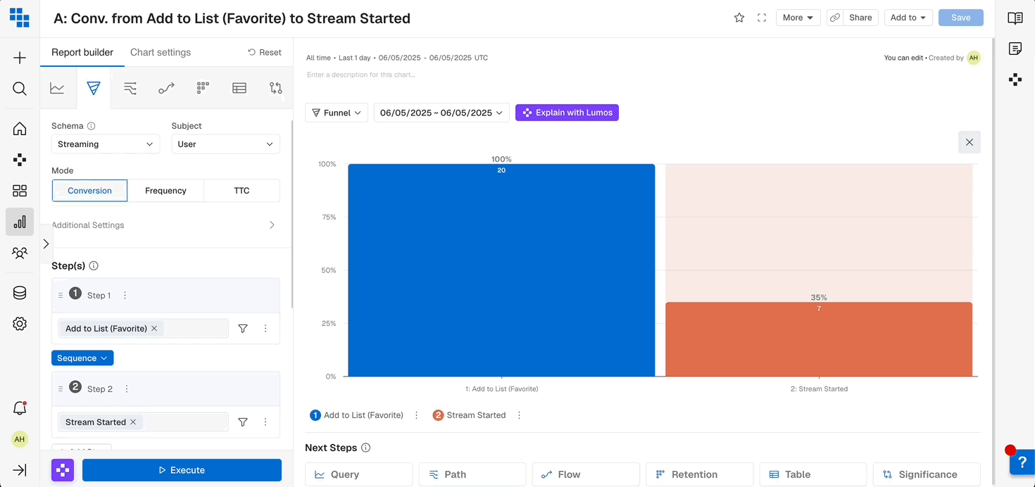 - You can give a name to each step to make it easier to differentiate in the chart. If no name is provided, default step names such as the event name will be used.