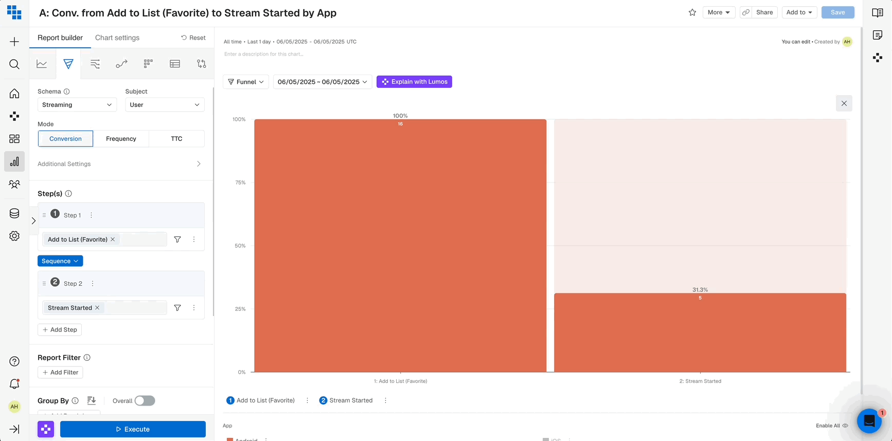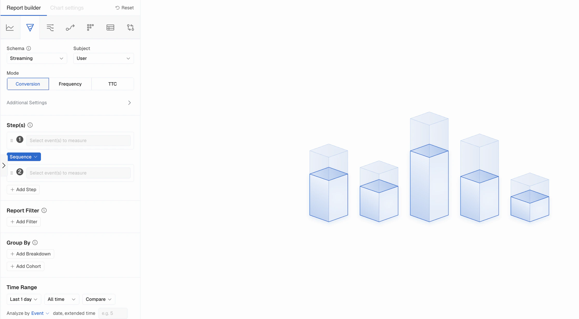 Funnel is a Formula used to analyze the conversion rates between multiple steps in a flow. Kubit counts the unique users at each step and allows you to visualize conversion rates based on your use case.- Each step can have one or more Events with Filters.