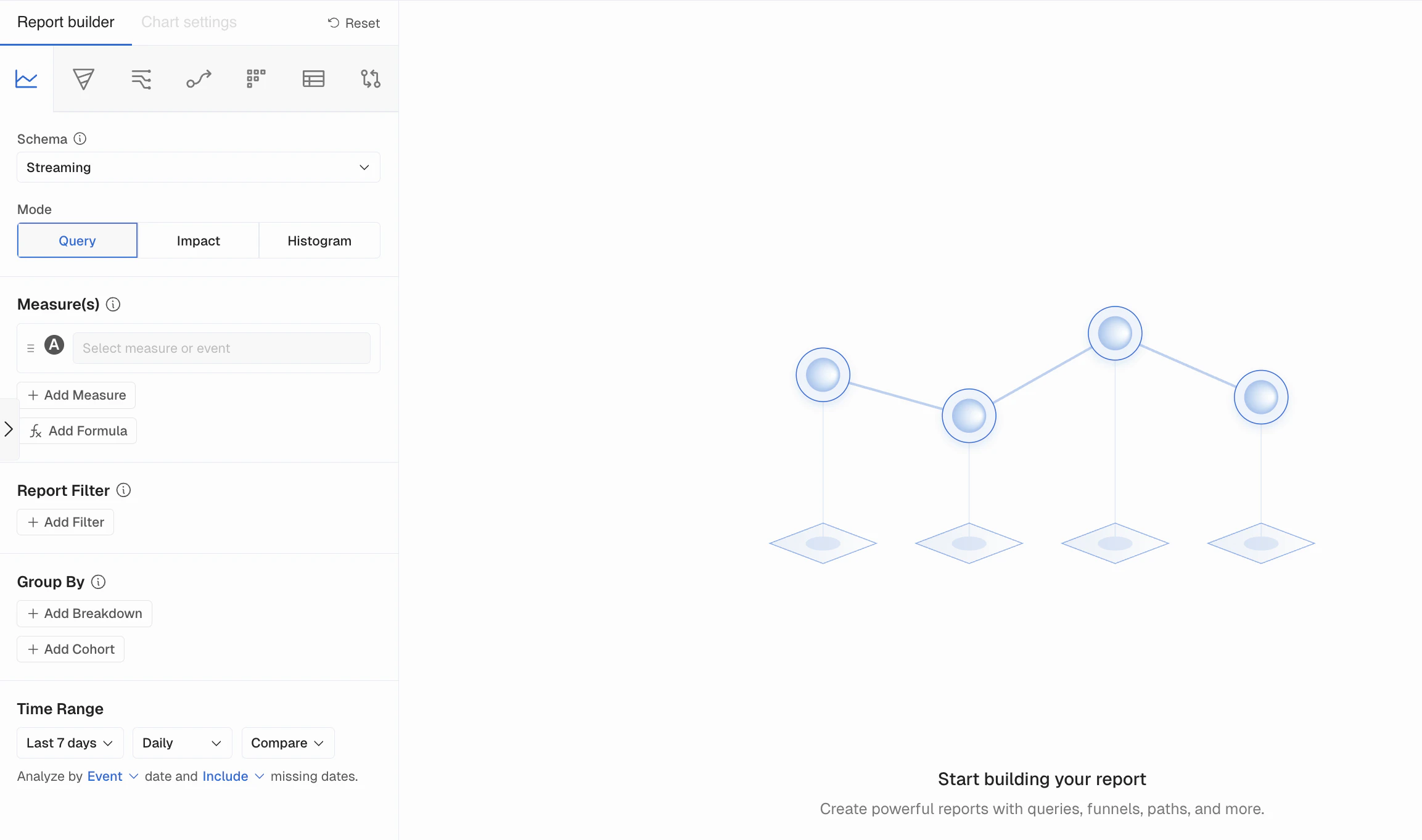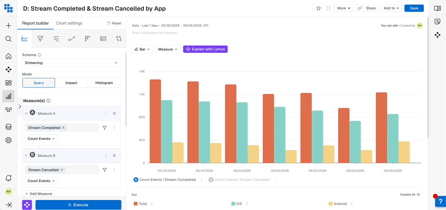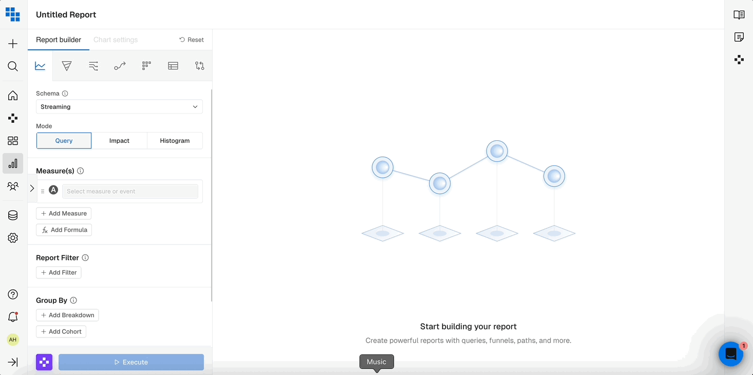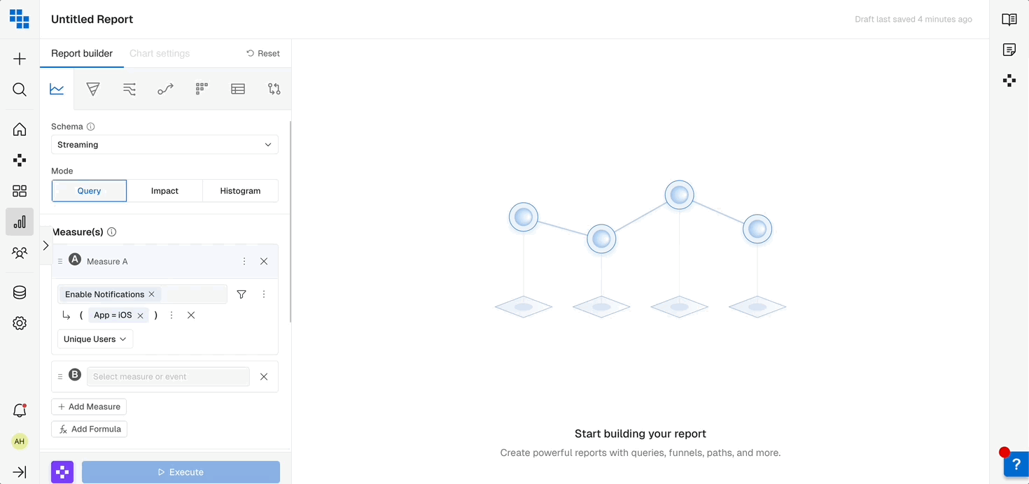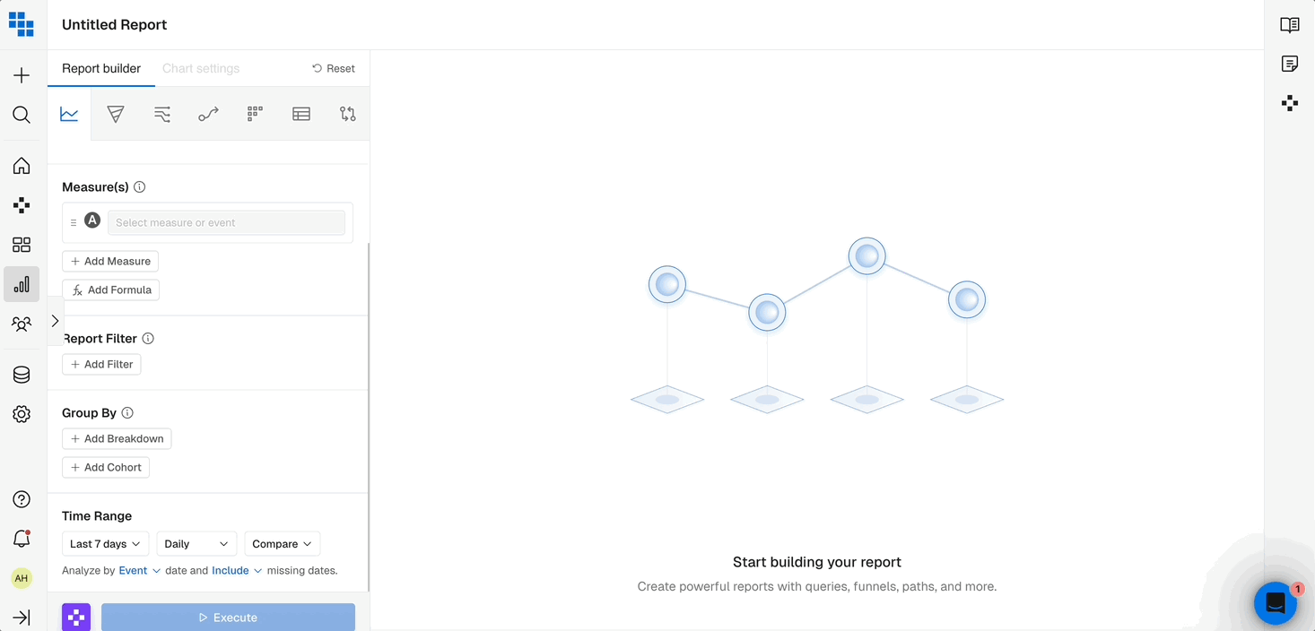 When you’re analyzing data it’s important to be able to slice it by various attributes of the User or Event. Breakdowns allow you to group the results by these fields and even Bin them into more meaningful groups in Query.- Breakdown by a Field: Select the field you want to breakdown by to see results grouped based on that fields values. These can be things like “User Type” or “Subscription Mode”.
