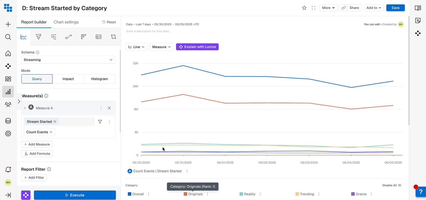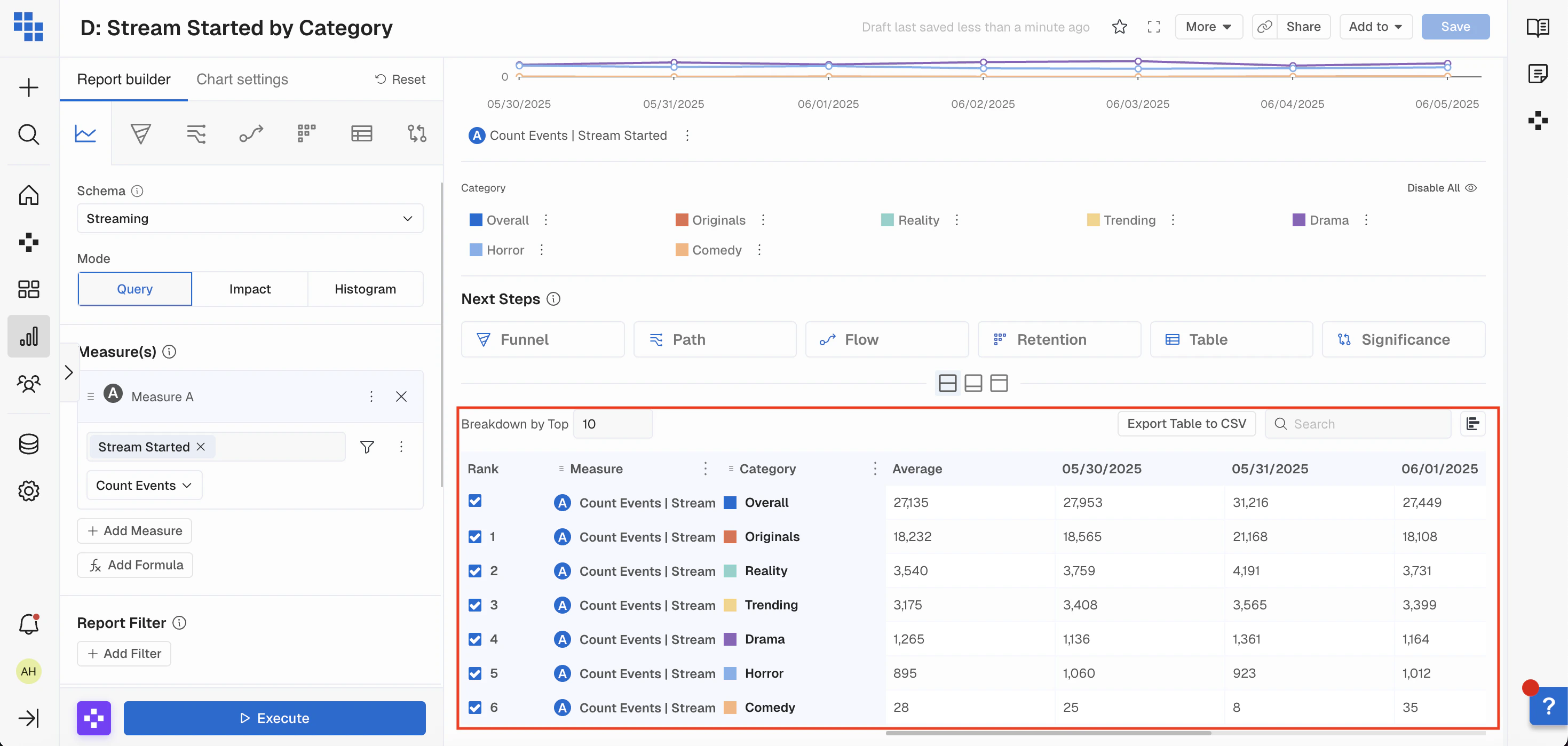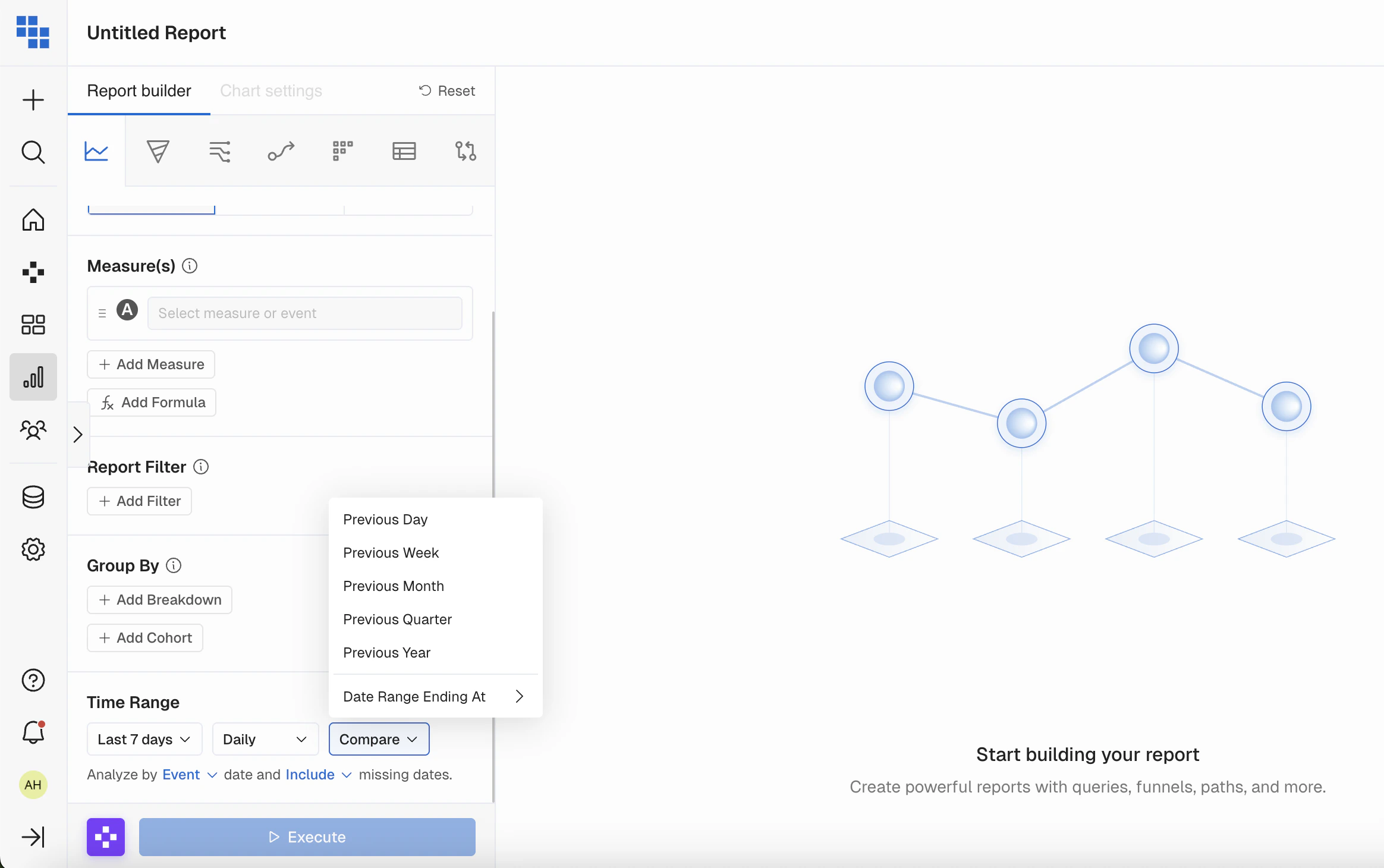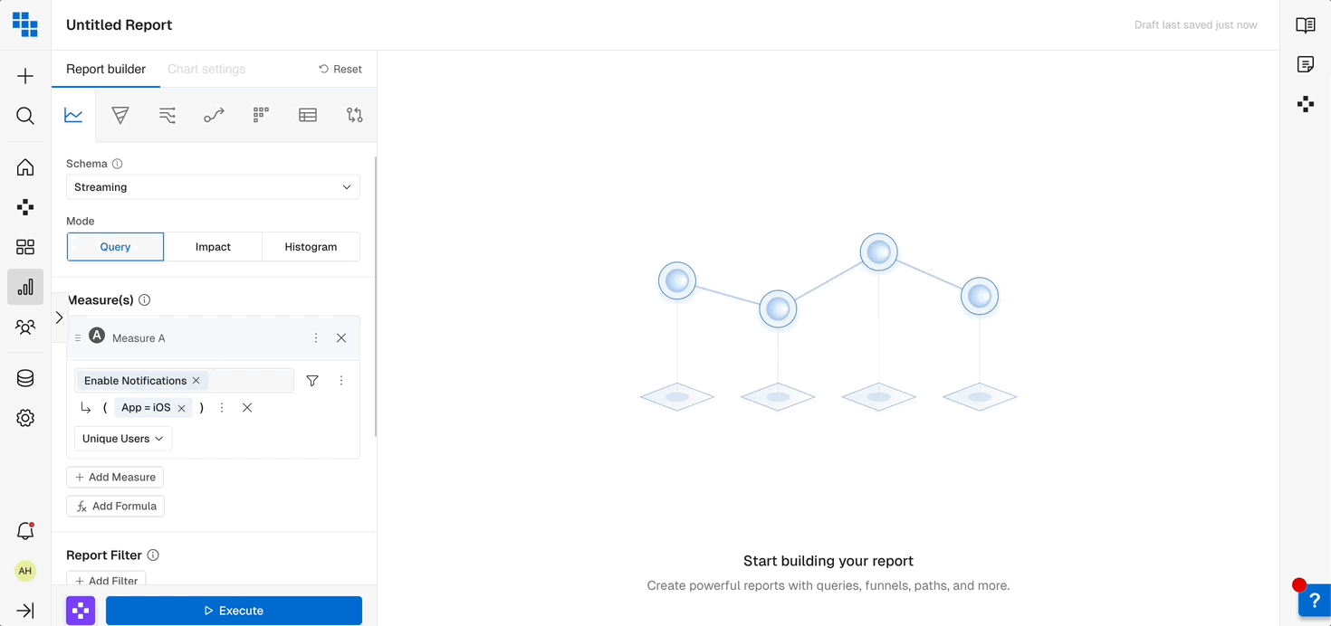 When you’re analyzing data it’s important to be able to slice it by various attributes of the User or Event. Breakdowns allow you to group the results by these fields and even Bin them into more meaningful groups in Query.- Breakdown by a Field: Select the field you want to breakdown by to see results grouped based on that fields values. These can be things like “User Type” or “Subscription Mode”.