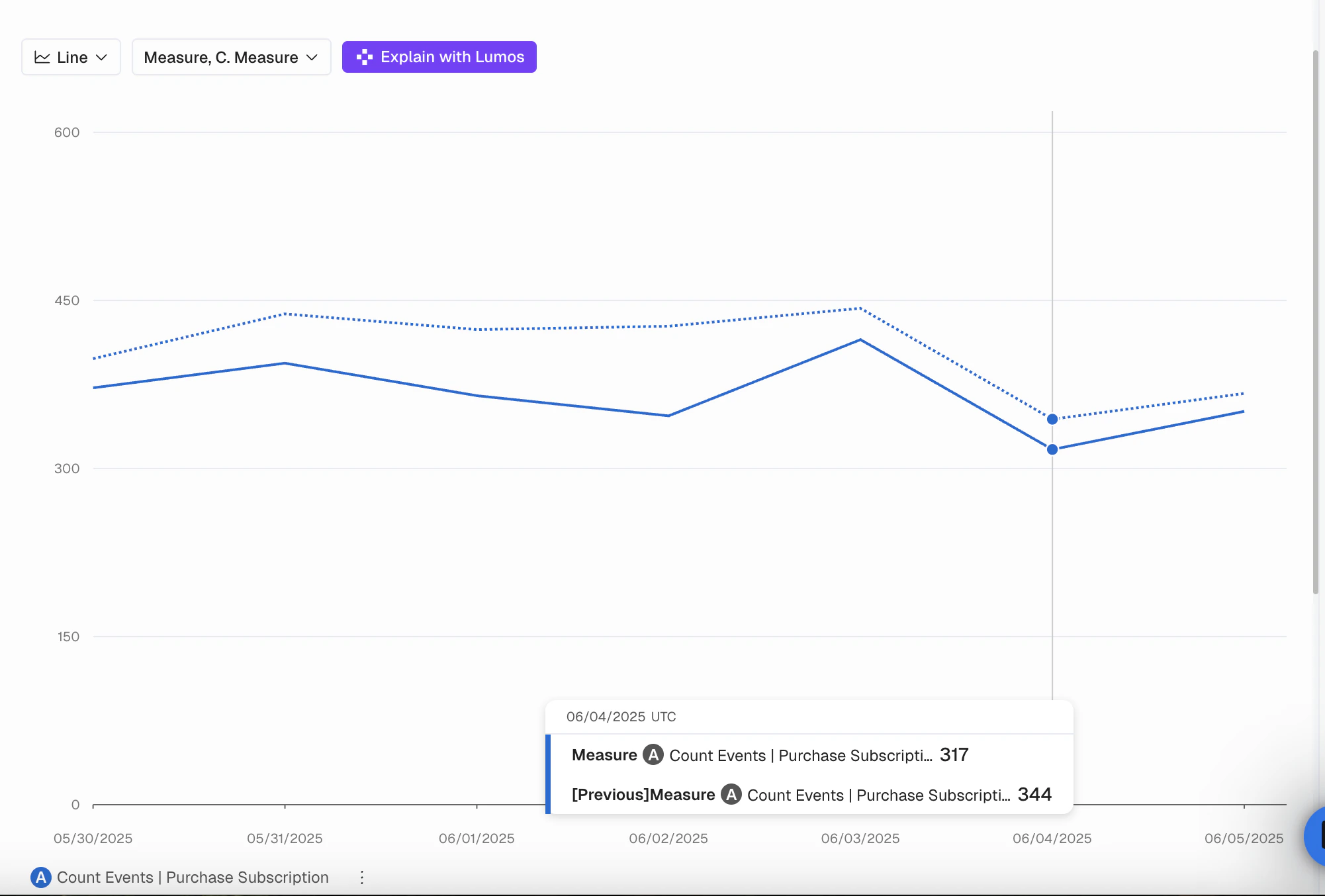 Compare any metrics for the previous period will be displayed as a dotted line on the chart, while the metrics for the current period will be displayed as a regular line, as shown here: