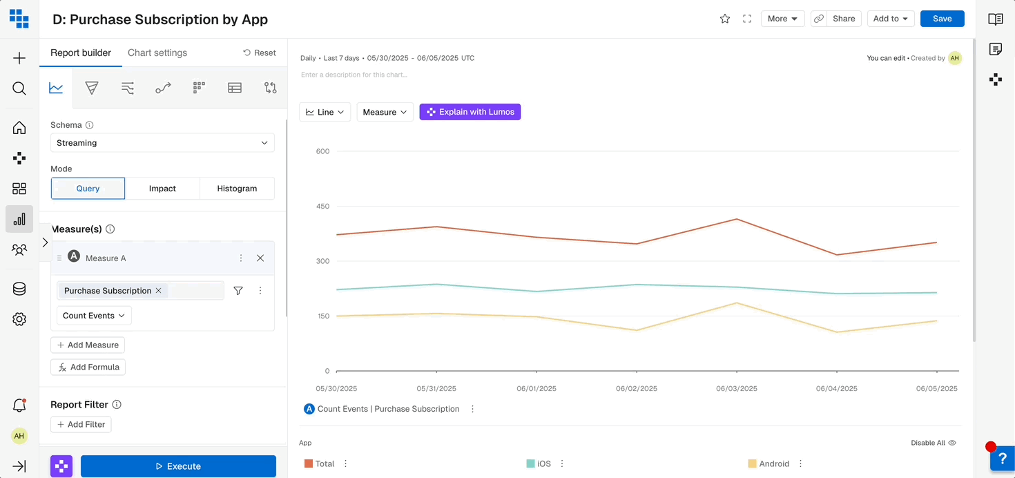A measure consists of three components: the event to analyze, the function to compute, and any filters to apply. You can learn more about Measures in this article about components of a Measure.Event